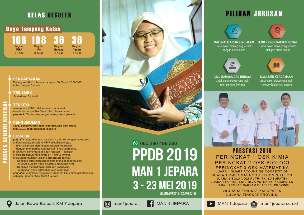Sehubungan dengan Libur awal Ramadhan 1440 H, Senin s.d. Rabu, 6 – 8 Mei 2019, maka layanan PPDB MAN 1 JEPARA Diliburkan. Buka kembali, Kamis,09… Selengkapnya »PENGUMUMAN PPDB