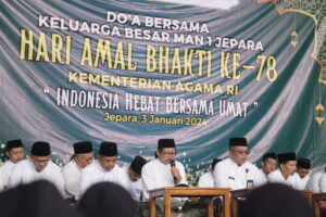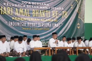 Jepara (www.man1jepara.sch.id) – Dalam rangka memperingati Hari Amal Bhakti (HAB) ke-78 Kementerian Agama Republik Indonesia (Kemenag RI), MAN 1 Jepara menggelar doa bersama dan istighosah. Acara berlangsung pada Selasa, 2 Januari 2024 di Sport Center diikuti oleh seluruh warga madrasah yang berjumlah 1400 orang terdiri dari siswa, guru dan pegawai.