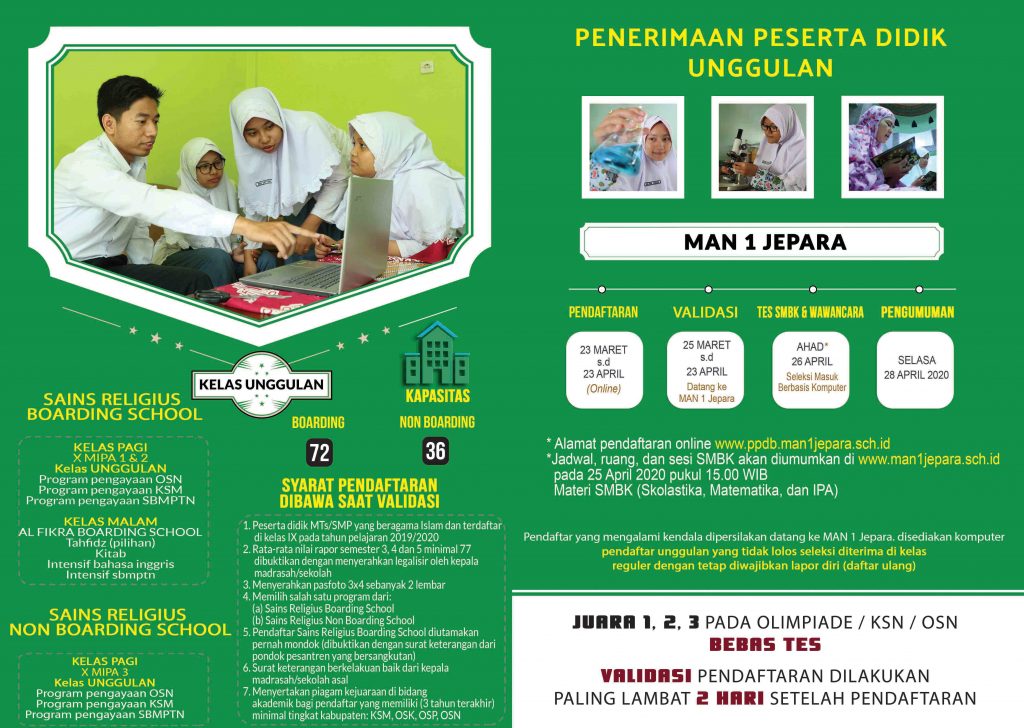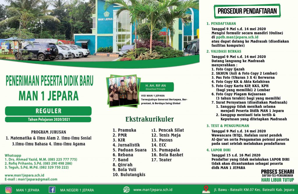 PPDB MAN 1 JEPARAoleh HUMAS MAN 1 Jepara26/02/202023/03/2020 PENERIMAAN PESERTA DIDIK BARUMAN 1 JEPARA TAHUN PELAJARAN 2020/2021 Bagikan ini: Bagikan ke X(Membuka di jendela yang baru) X Bagikan pada Facebook(Membuka di jendela yang baru) Facebook Berbagi di Tumblr(Membuka di jendela yang baru) Tumblr Bagikan ke WhatsApp(Membuka di jendela yang baru) WhatsApp Menyukai ini:Suka Memuat... Related Tinggalkan Balasan Batalkan balasanAlamat email Anda tidak akan dipublikasikan. Ruas yang wajib ditandai *Nama * Email * Situs Web Komentar * Simpan nama, email, dan situs web saya pada peramban ini untuk komentar saya berikutnya. Beritahu saya akan tulisan baru melalui surel. Δ